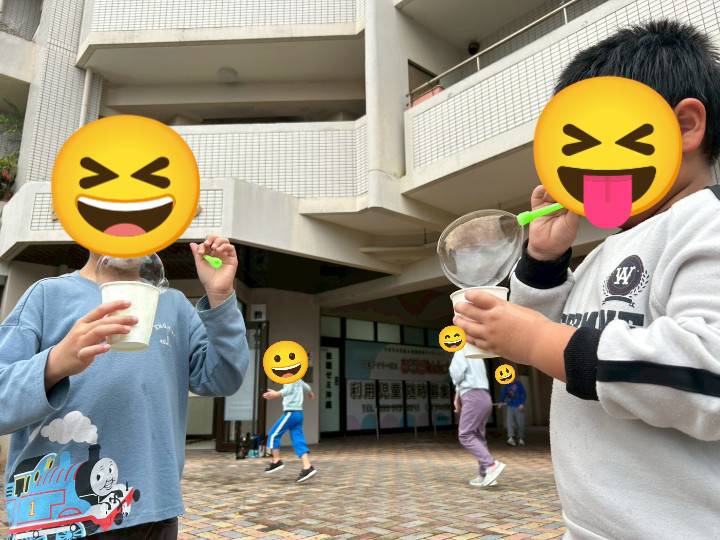 自由時間には、外に出てシャボン玉で遊びました!大きな風船できるかな?😁