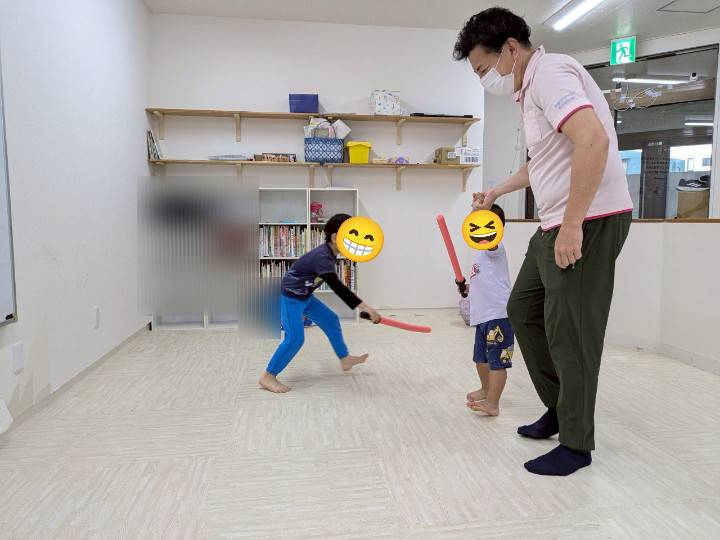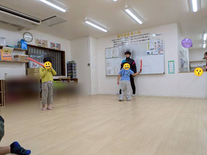 未就学児は、目隠しなしで対戦しました!上手く避けたり、チャンバラ棒で足を狙ったり出来ていました😉
