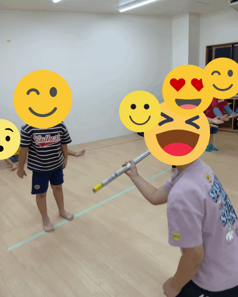 投げる側も、ただ投げるのではなく、**“下から上にふわっと投げる”**ことを意識して取り組みました。強く投げると棒が回りすぎてキャッチしづらくなるため、力加減を調整する良い練習になります♪