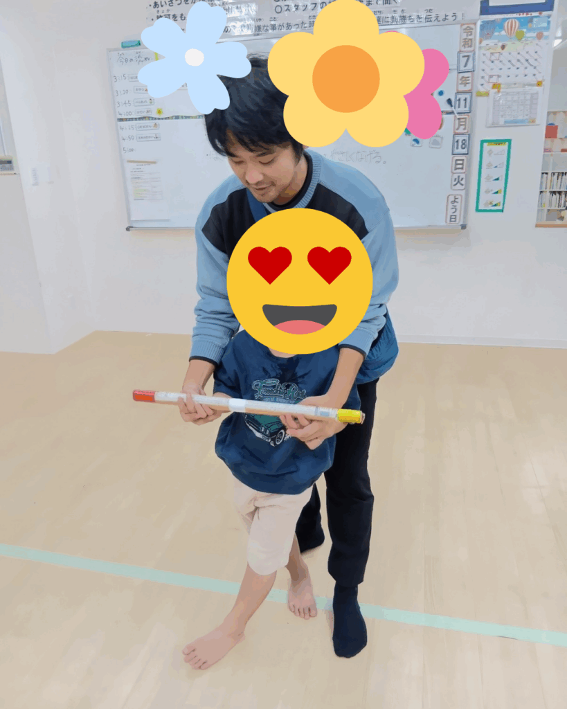 今日はコグトレ棒を使って、色に注目しながらキャッチする活動を行いました。棒には黄色・青・白のテープが貼られており、職員が「きいろ!」「あお!」などと声を掛けると、子どもたちはその色を素早く見つけてキャッチするゲームをおこないました👏