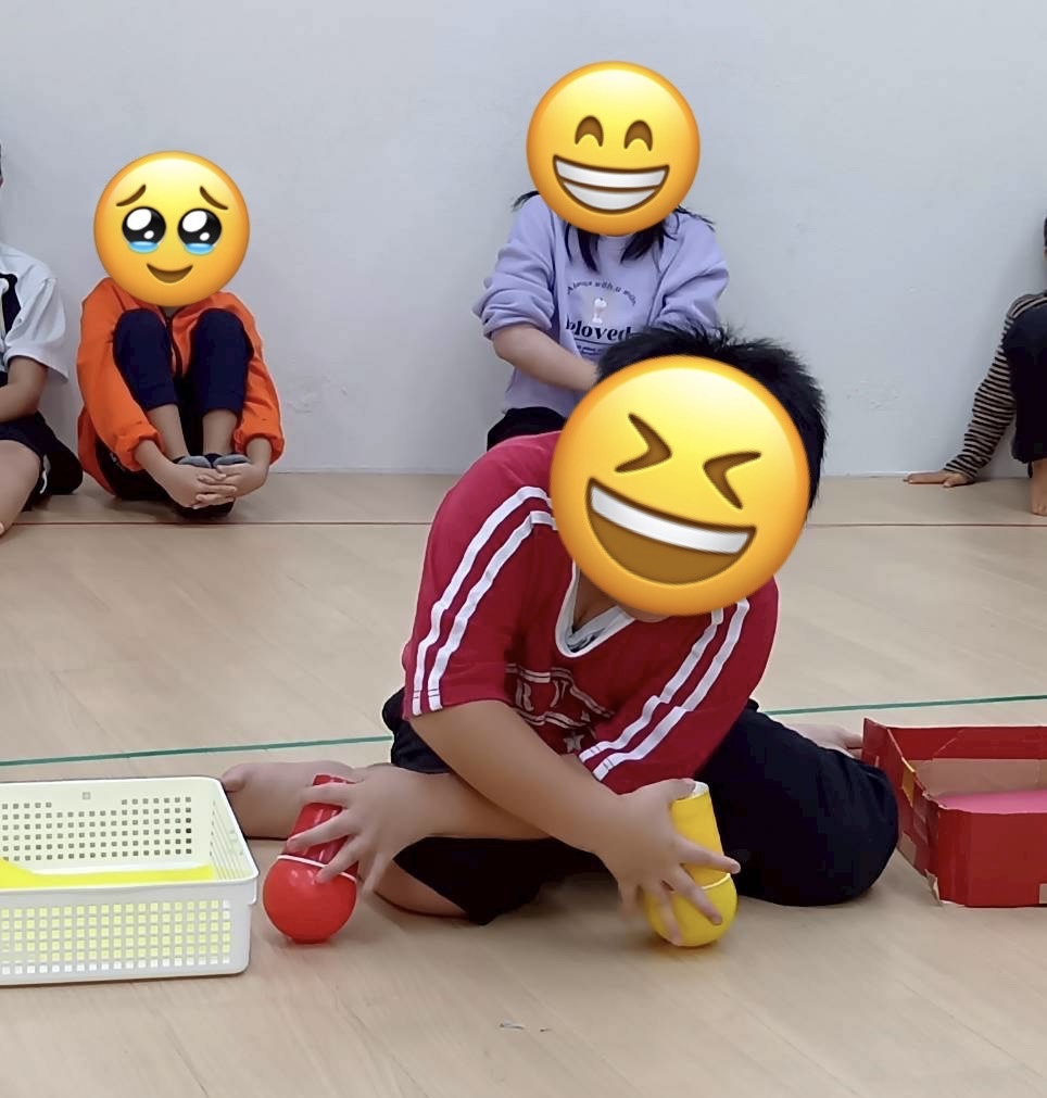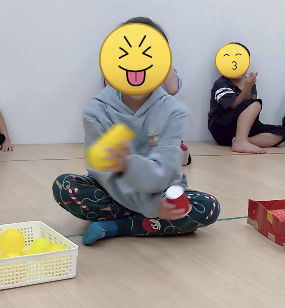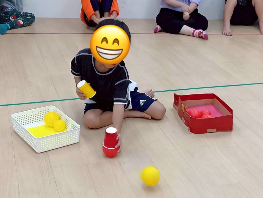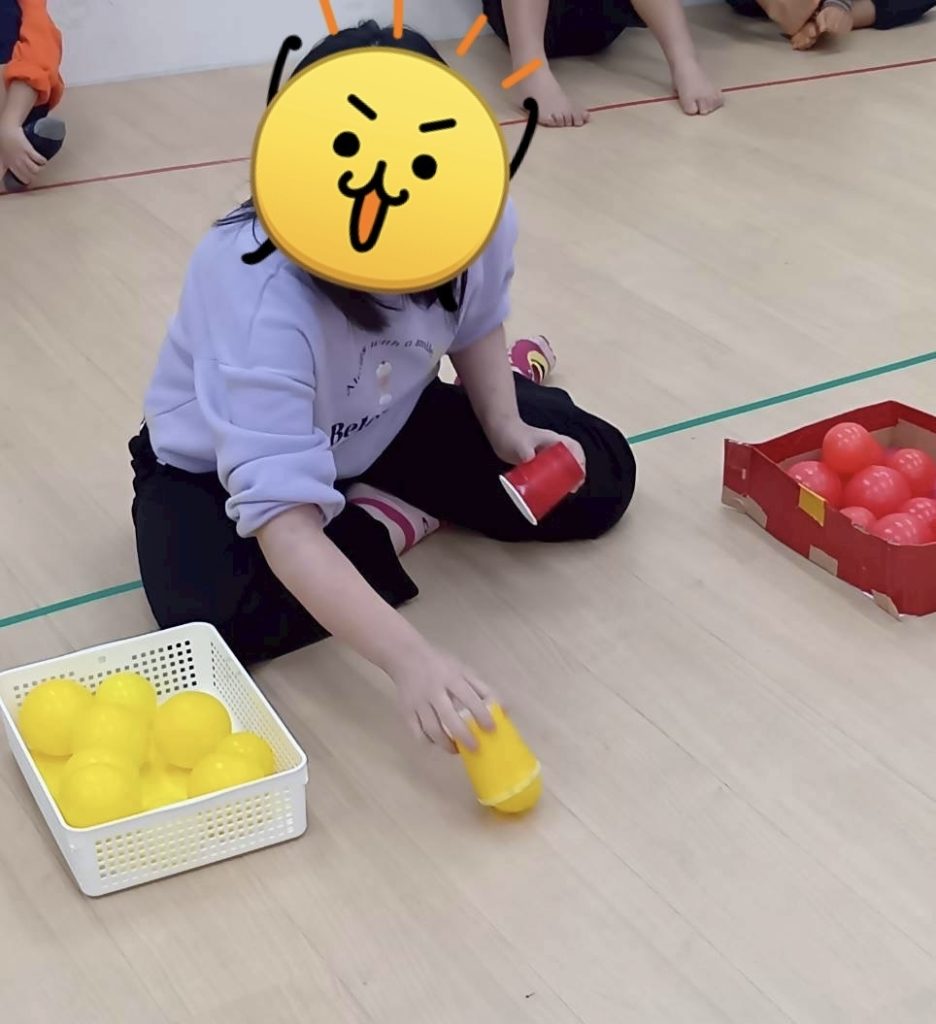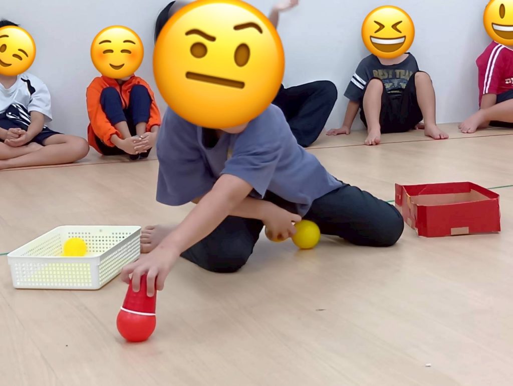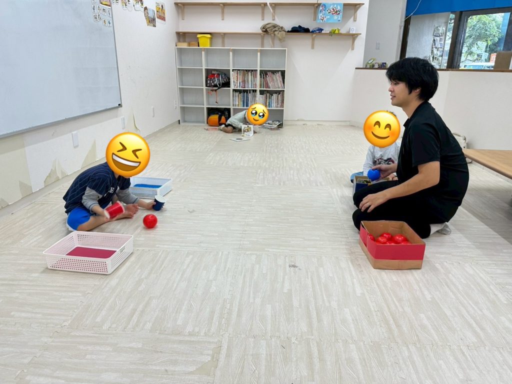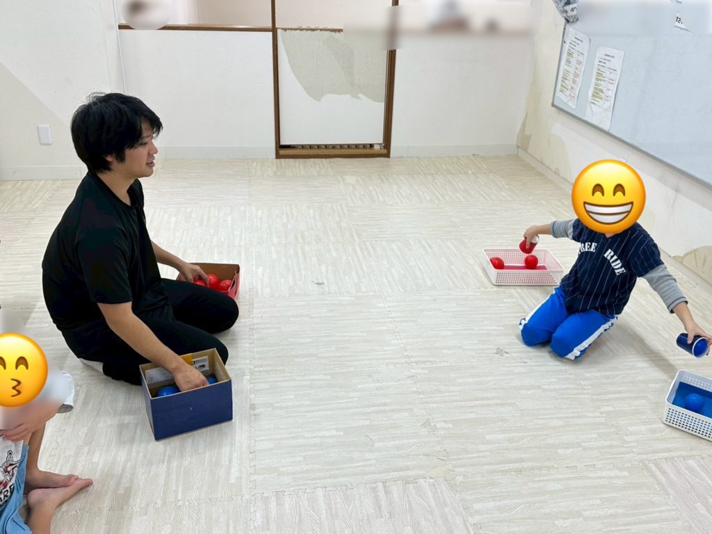 ボールの色🔴🔵を確認し、箱の位置📦に目を向けながら入れようとする様子が見られ、繰り返す中で両手の動き🙌やタイミングが少しずつ安定していきました😊