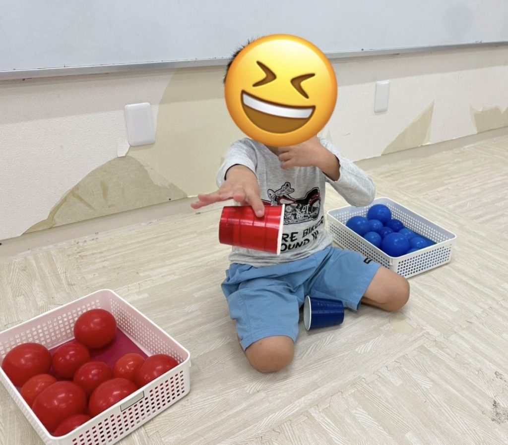 床に座り🧎♀️🧎♂️、赤🔴と青🔵の色がついた紙コップを両手に持って、転がってくるボールをよく見ながら👀キャッチし、同じ色の箱📦に入れる活動を行いました✨