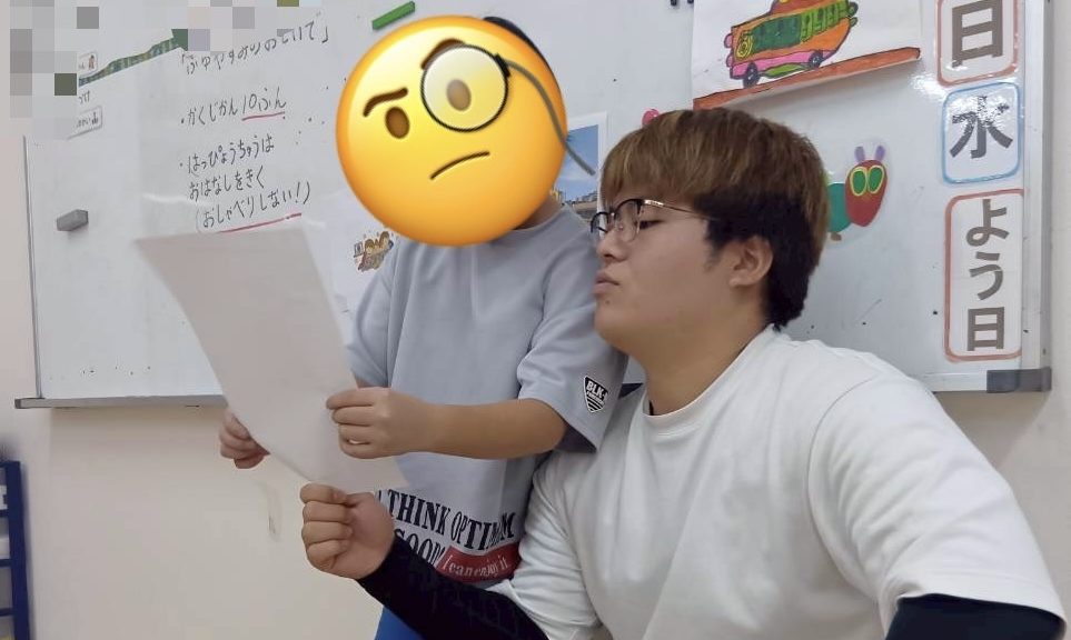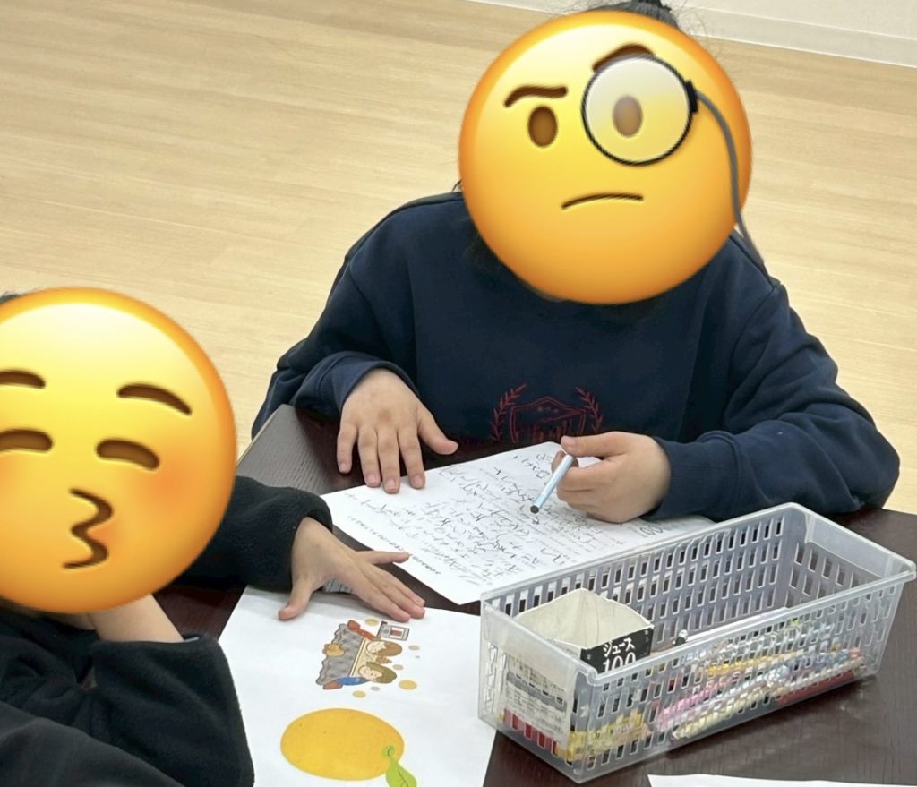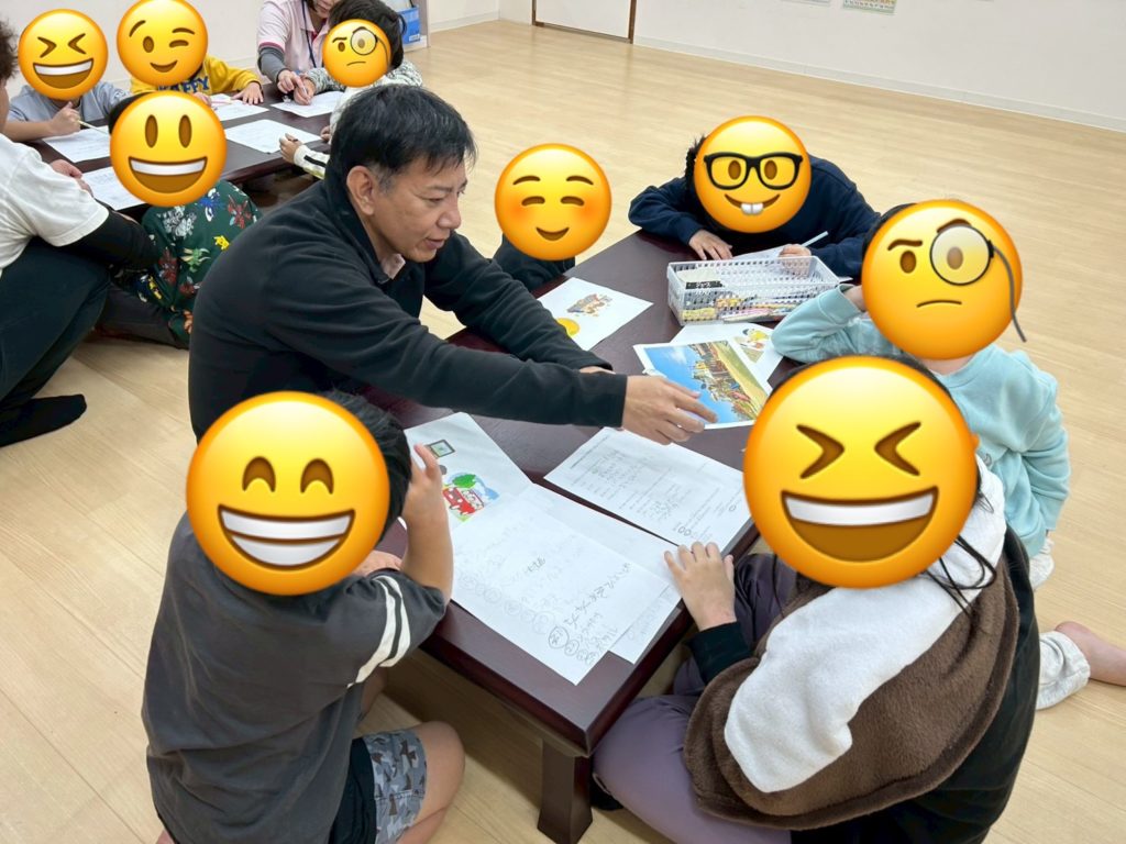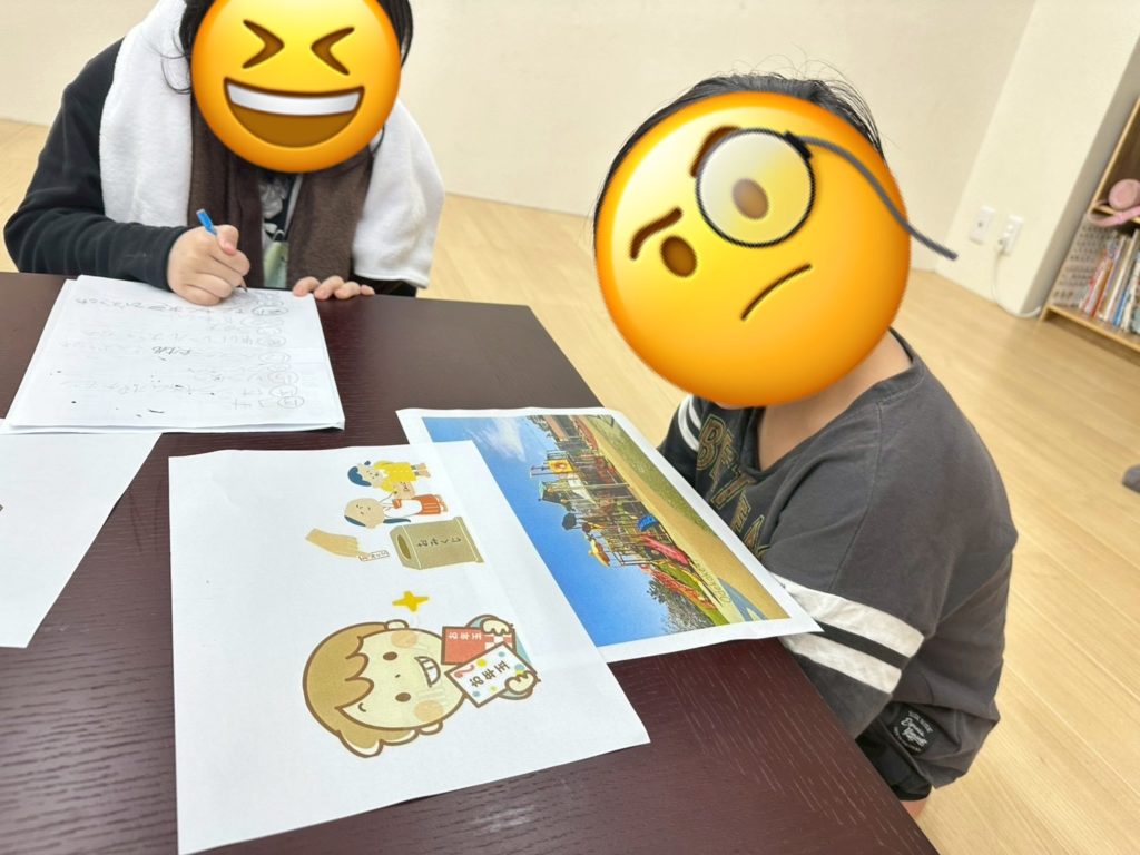 イラスト・写真や思い出を振り返りながら📸✨「ここ行ったよ」「これ楽しかった」と、スタッフに伝えたり😊言葉を選びながら、一生懸命書いています✏️