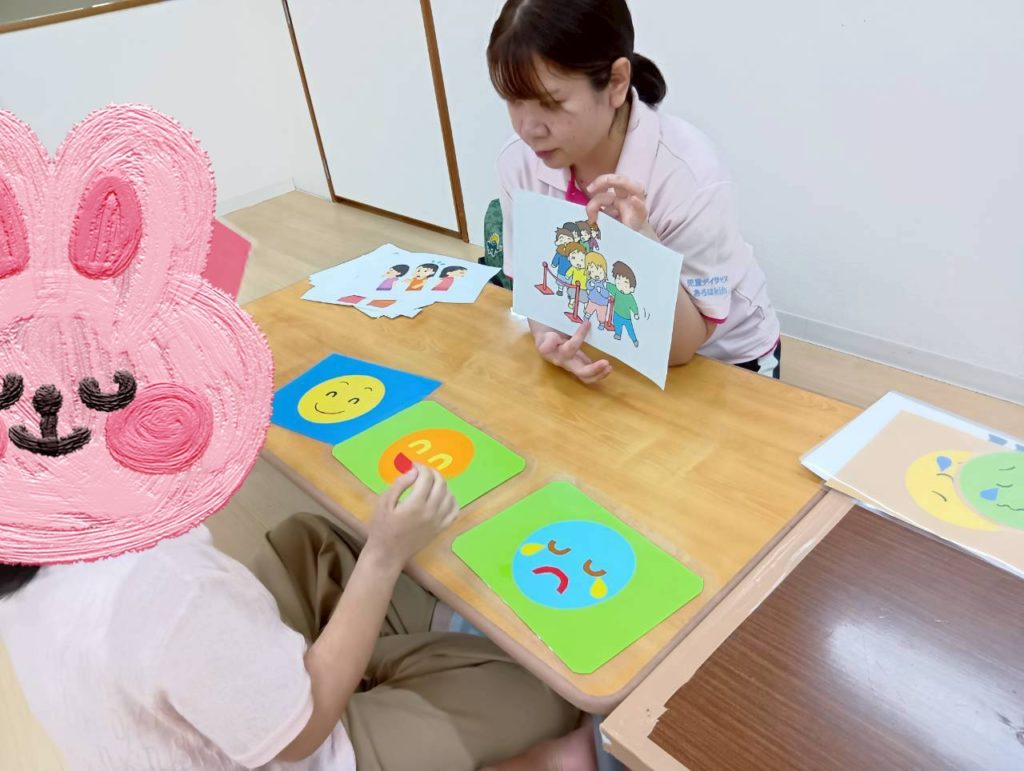 一方、未就学児さんは室内で「表情&場面理解」の活動を行いました😊職員が用意したカードや写真を使い、「この顔はどんな気持ち?」「どんなときにこうなるかな?」と質問すると、「うれしい!」「泣いてるから悲しい」など、自分の言葉で答える姿が見られました。また、「おもちゃを取られたらどうする?」など具体的な場面設定では、「返してって言う」「順番を待つ」など適切な行動を考えることができました。中には「ありがとうって言うんだよ」と友達に説明してあげる優しい姿もありました。感情を理解し、相手の気持ちを想像する力を楽しく身につけられる時間になりました。