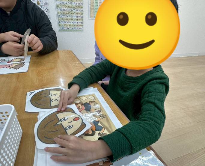 他にもイラストをみせて、相手がどんな気持ちなのかを表情カードを使って指差しで確認☝️